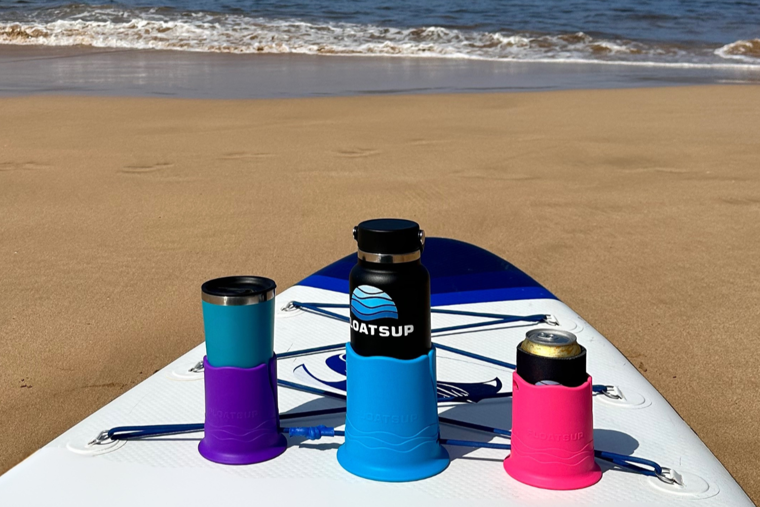The patented Floatsup® Cup is an innovative can, bottle, and drink holder for paddle boards and kayaks. It installs easily on existing bungee cords! Now in JUMBO size too!
